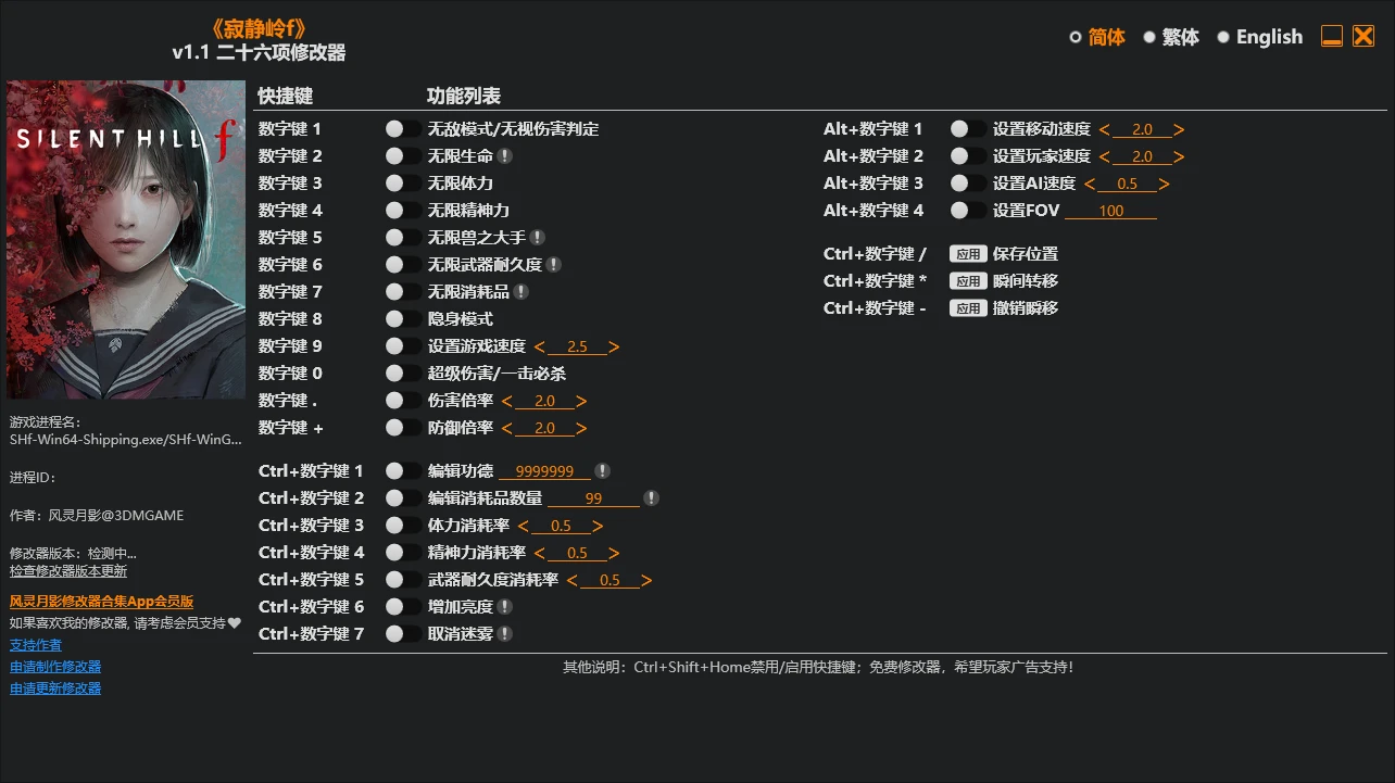 先打开修改器,再打开游戏,使用快捷键和按钮启用功能即可