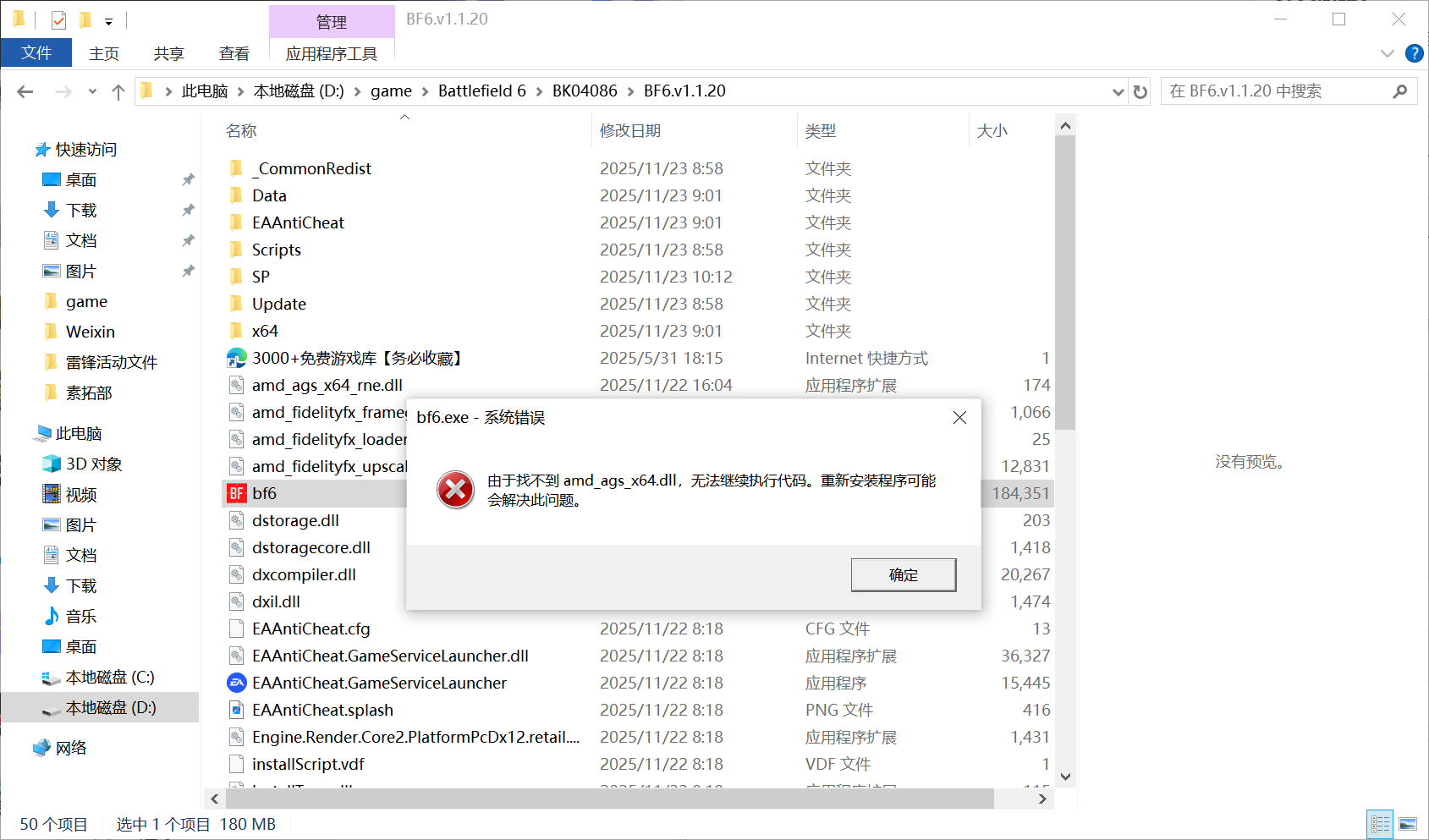 我试了重下和dll修复,但是显示是amd_ags_x64.dll找不到
