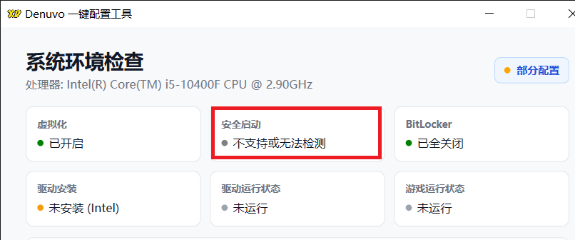 论坛 蒸汽游戏宝库论坛 游戏问题求助区 无主之地4,安全启动已经禁止,但配置工... 通知 Clear all 无主之地4,安全启动已经禁止,但配置工具显示不支持或无法显示。 RSS shijunfeng1 (@shijunfeng1) Lv.0 新注册 Registered 加入时间: 1 月 前 帖子: 1 话题发起人 28/02/2026 10:07 上午 无主之地4,安全启动已经禁止,但配置工具显示不支持或无法显示 Denuvo-一键配置工具-2026-02-28-10_02_42.png 引用 话题标签 无主之地4