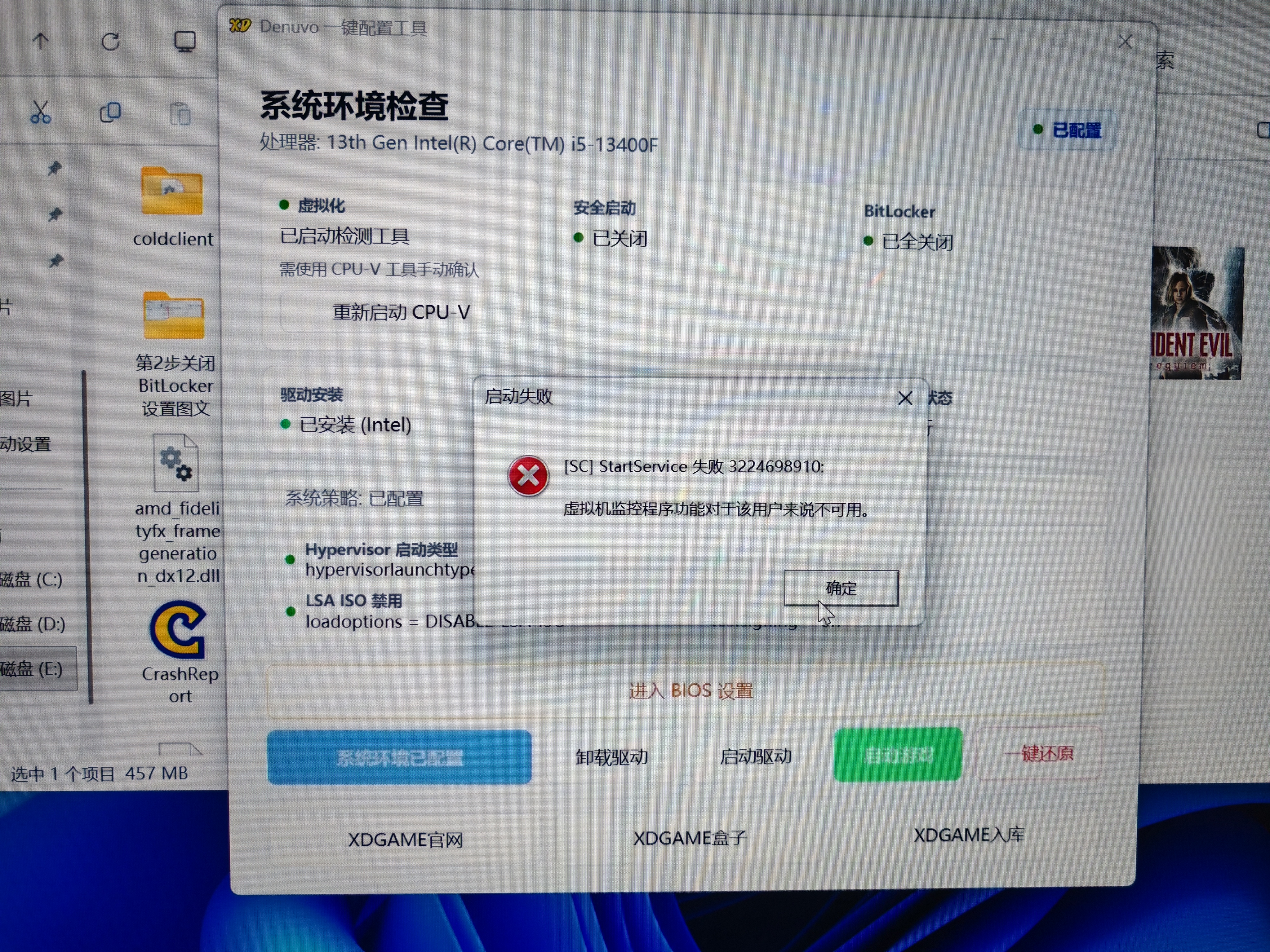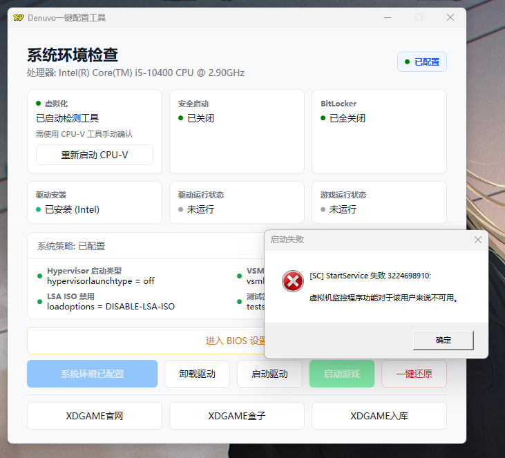 论坛 蒸汽游戏宝库论坛 游戏问题求助区 驱动启动失败 通知 Clear all 驱动启动失败 RSS 彳亍彳亍 (@彳亍彳亍) Lv.0 新注册 Registered 加入时间: 3 小时 前 帖子: 2 话题发起人 28/02/2026 3:20 下午 安装驱动后,驱动不给我打开,有办法搞吗 141a8cd0-0724-475a-b5fa-7fc1df3e79f8.png 引用 力大飞砖 (@xiangjiaoshu) Lv.0 新注册 Registered 加入时间: 11 月 前 帖子: 1 28/02/2026 4:09 下午 遇到一样的问题,蹲个大佬解答 IMG_20260228_160821.jpg 回复引用 彳亍彳亍 (@彳亍彳亍) Lv.0 新注册 Registered 加入时间: 3 小时 前 帖子: 2 话题发起人 28/02/2026 4:59 下午 @xiangjiaoshu 已经解决了,下载如图inspectre(可以百度),此图这两选项显示的就行 1772269020188.jpeg 回复引用