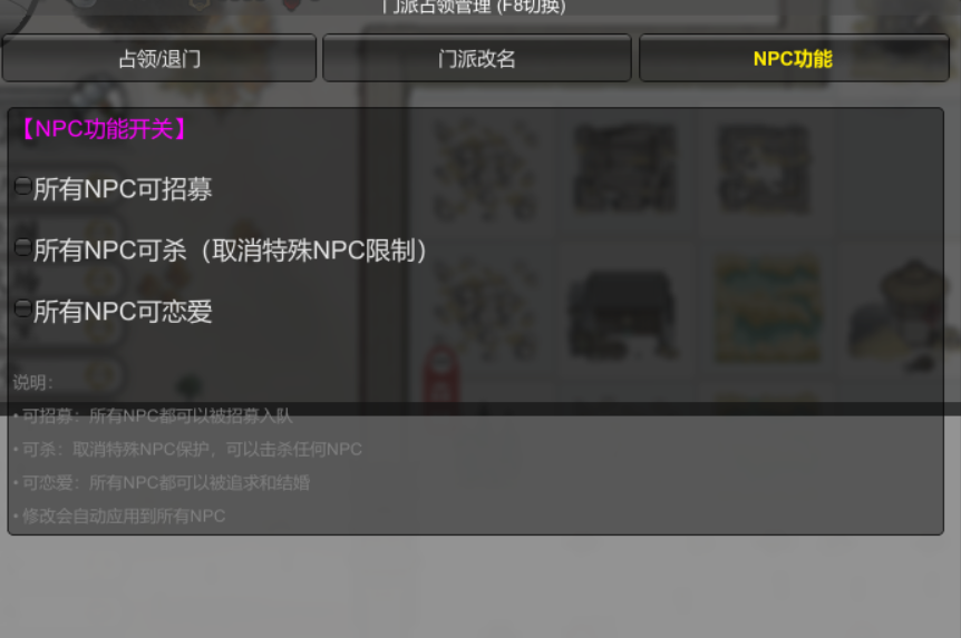提示:有保留该门派弟子功能,若选择了保留,玩家会直接成为掌门,原掌门变成副掌门。若不保留,该门派所有npc变为江湖散人。