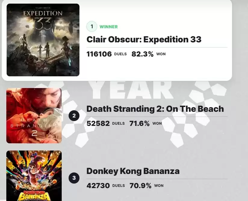 在这场激烈的票选活动中,《光与影:33号远征队》以 116,106票、高达 82.3% 的压倒性支持率稳居第一,毫无悬念成为最大赢家。紧随其后的是《死亡搁浅2:冥滩之上》和《咚奇刚:蕉力全开》,分别获得 52,582票(71.6%) 和 42,730票(70.9%),位列第二与第三。